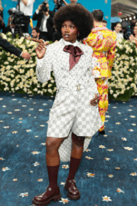 The “DENIAL IS A RIVER” and “Anxiety” singer pulled up to the Met in trouser shorts with a matching coat and tails. Her outfit was a Pharrell Williams-designed piece by Louis Vuitton paired with Tiffany & Co. jewels.