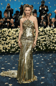 Although she didn’t get the suit memo, Hadid wore a beautiful gold custom gown by Mui Mui that represented black-style to a T. The goddess-like dress paid homage to two Black women as she mentioned in an interview with Vogue. Designer Zelda Wynn Valdez spent her life tailoring pieces for Black People, like triple-threat Josephine Baker, who previously wore this dress.