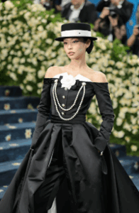 Member of Blackpink and co-star of the new Chanel 25 bag’s campaign, Jennie, used Chanel’s grace to fit perfectly with the theme. Jennie wore an off-the-shoulder black satin jumpsuit and a match skirt over top to add some drama. She topped her look off with a two-toned hat, Chanel, pumps, and pearls throughout.