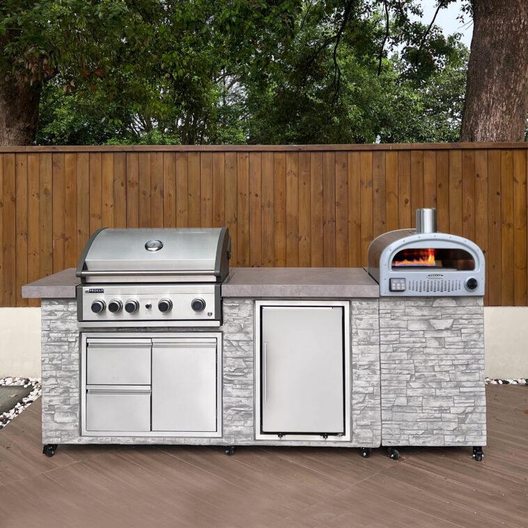 Our top choice? The Prokan 96″ European Ledge 5-Burner Island Grill W/ Fridge And Outdoor Oven, which combines powerful grilling and precise baking in one stylish unit! Complete with four 304 Stainless Steel burners, one dedicated rear burner, a 52,000 BTU output, a slab stone countertop for prep space, built-in grill lights, a built-in 63L fridge, and a KANO 4-in-1 oven with a 356 °F to 896 °F temperature range regulated by a digital controller, this island grill elevates outdoor cooking, making backyard entertaining effortless and enjoyable. The oven even features digital temperature control, a touchscreen interface, a meat probe, and a rotating pizza stone, making it perfect for pizzas, baking, and broiling and expanding your patio-side meal choices.