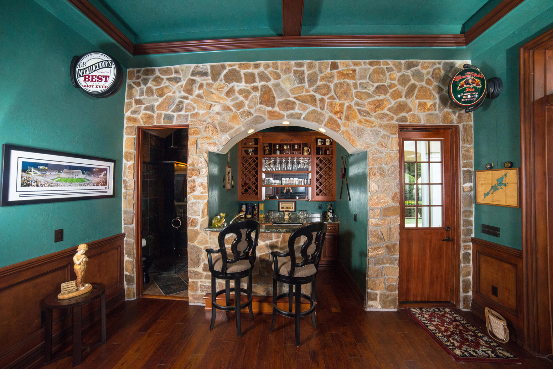 When styling a room around a dark color, look for inspiration in contrasting design elements. The cream color found in the stone on this accent wall adds height to the ceiling when used to paint the curve of the bar’s archway and brightness to the space without taking away its masculinity.