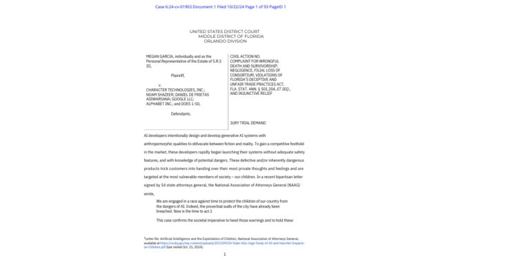 Below is the full court filing for the case Garcia v. Character Technologies Inc., involving claims of wrongful death, negligence, and violations of Florida’s Deceptive and Unfair Trade Practices Act. This document provides detailed insights into the case, including the claims and allegations made against the defendants.