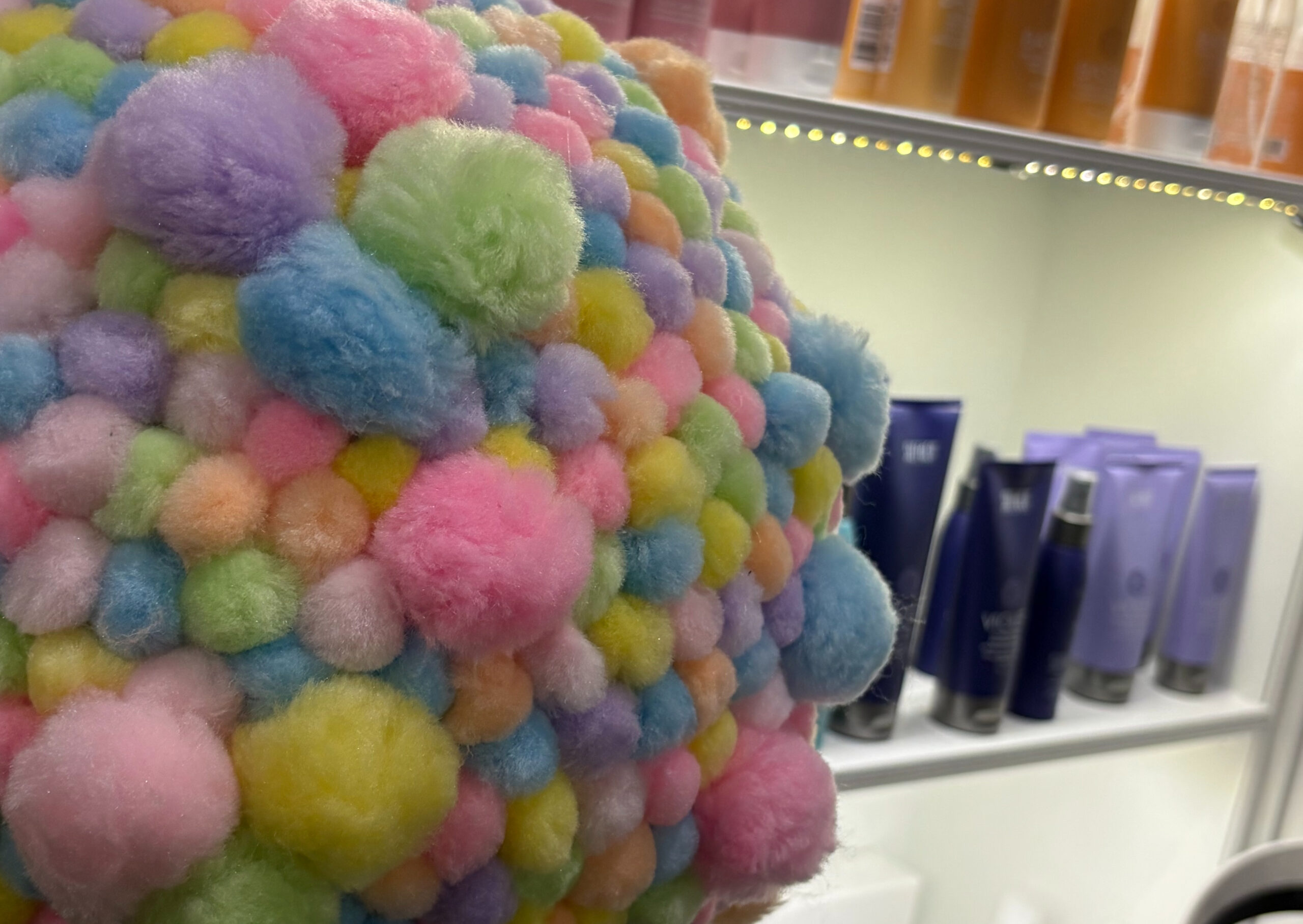Shampoos, conditioners and pom poms. One of these does not seem to belong, but they all make up a part of the current inside of the Mosaic Hair Studio and Blowout Bar in Ivanhoe.