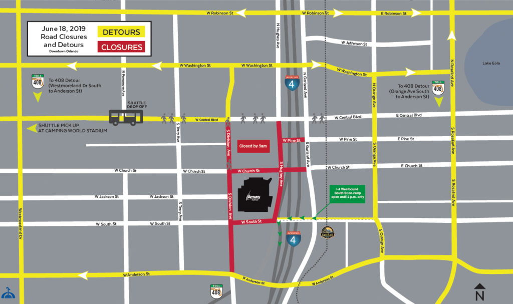 It is expected the roadways in the immediate area surrounding the Amway Center in downtown Orlando will begin closing starting at 9 a.m. on Tuesday, June 18, including: