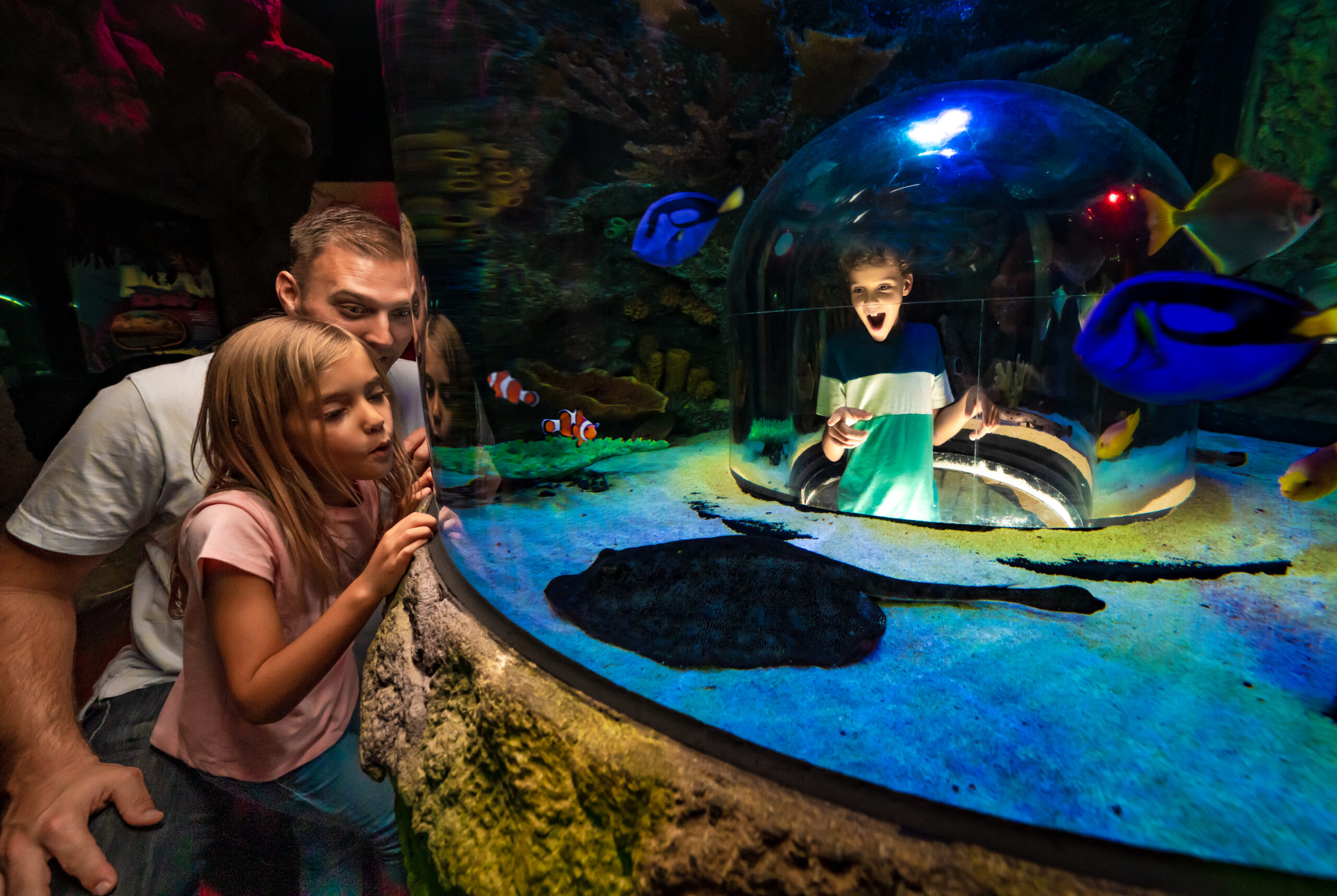 Visitors will be able to encounter more than 3,000 sea creatures representing over 150 species. Highlights include blacktip reef sharks, blue-spotted stingrays, and big-belly seahorses. The aquarium will house approximately 150,000 gallons of water and feature specialized environments such as a freshwater gallery, Stingray Bay, and an invertebrate touch pool designed for up-close encounters.