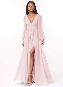 Flowy V-Neck Long Sleeve Chiffon Long Dress Blushing Pink